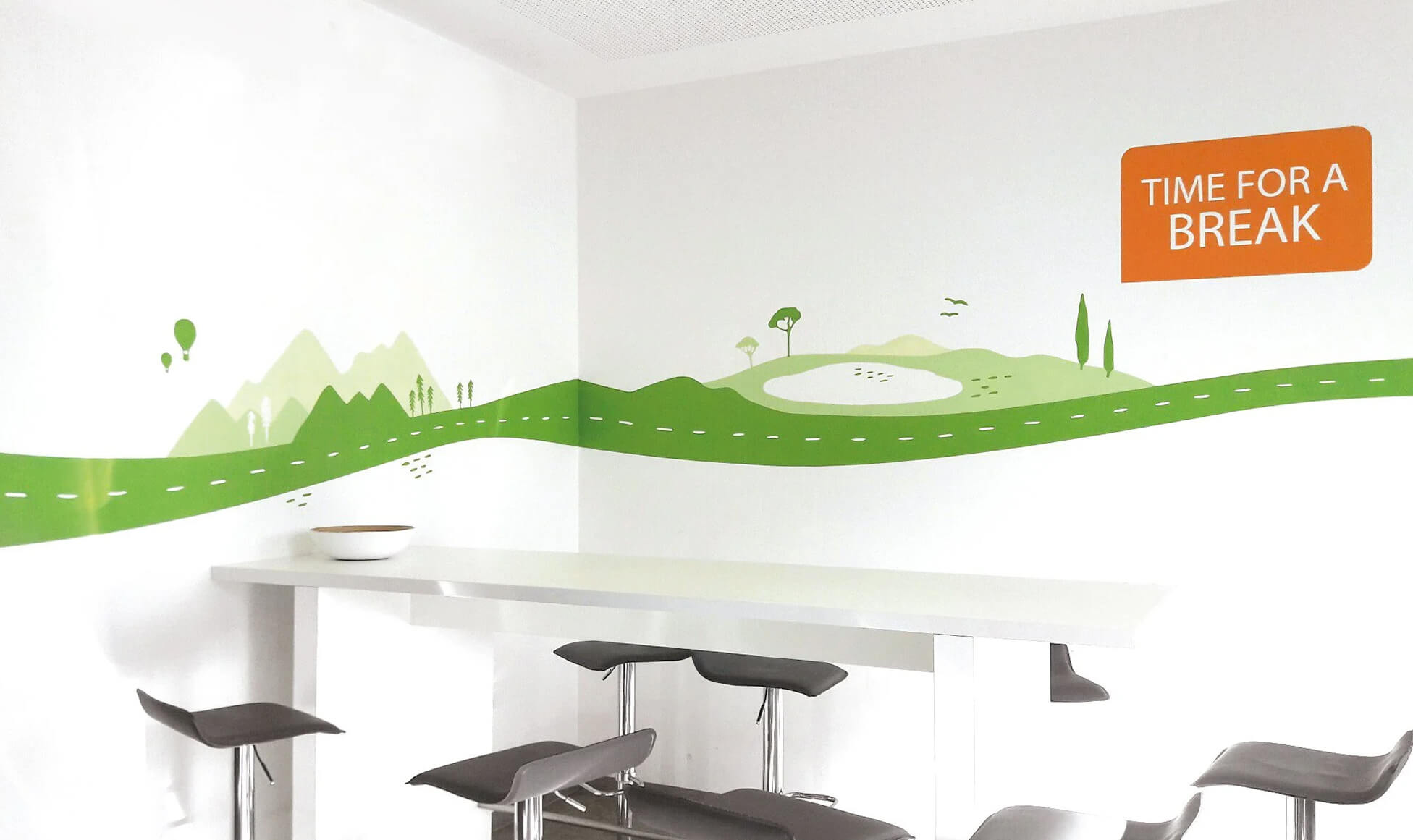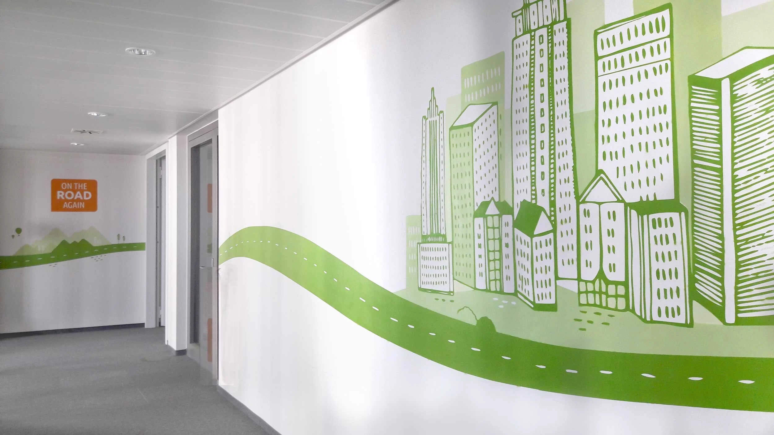 Before moving to the Kap West building, the headquarters was located on Birketweg for 4 years. At that time, the branding was a little more playful and focused more on the secondary color orange. The interior design was mainly planned and implemented in-house. The illustrations were created by the freelancer Veronika Winterholler. I planned the distribution across all floors and created suitable stencils, which were applied to the wall by the graffiti artists from Artmos4.
