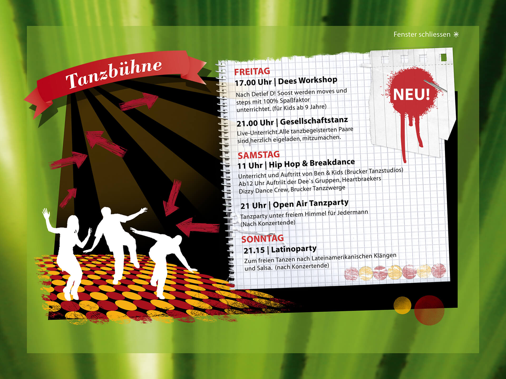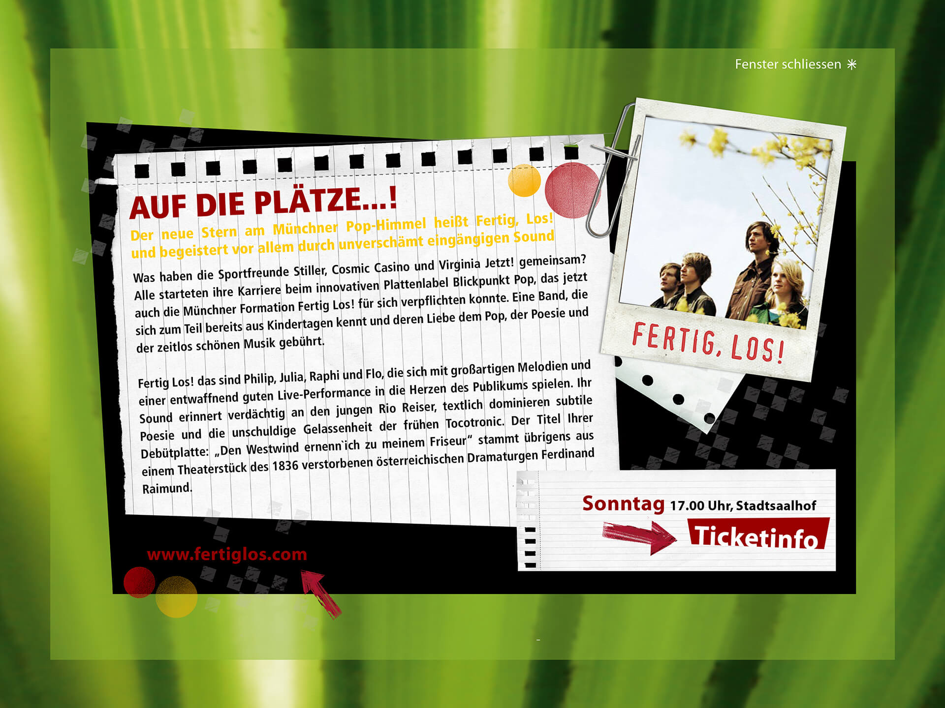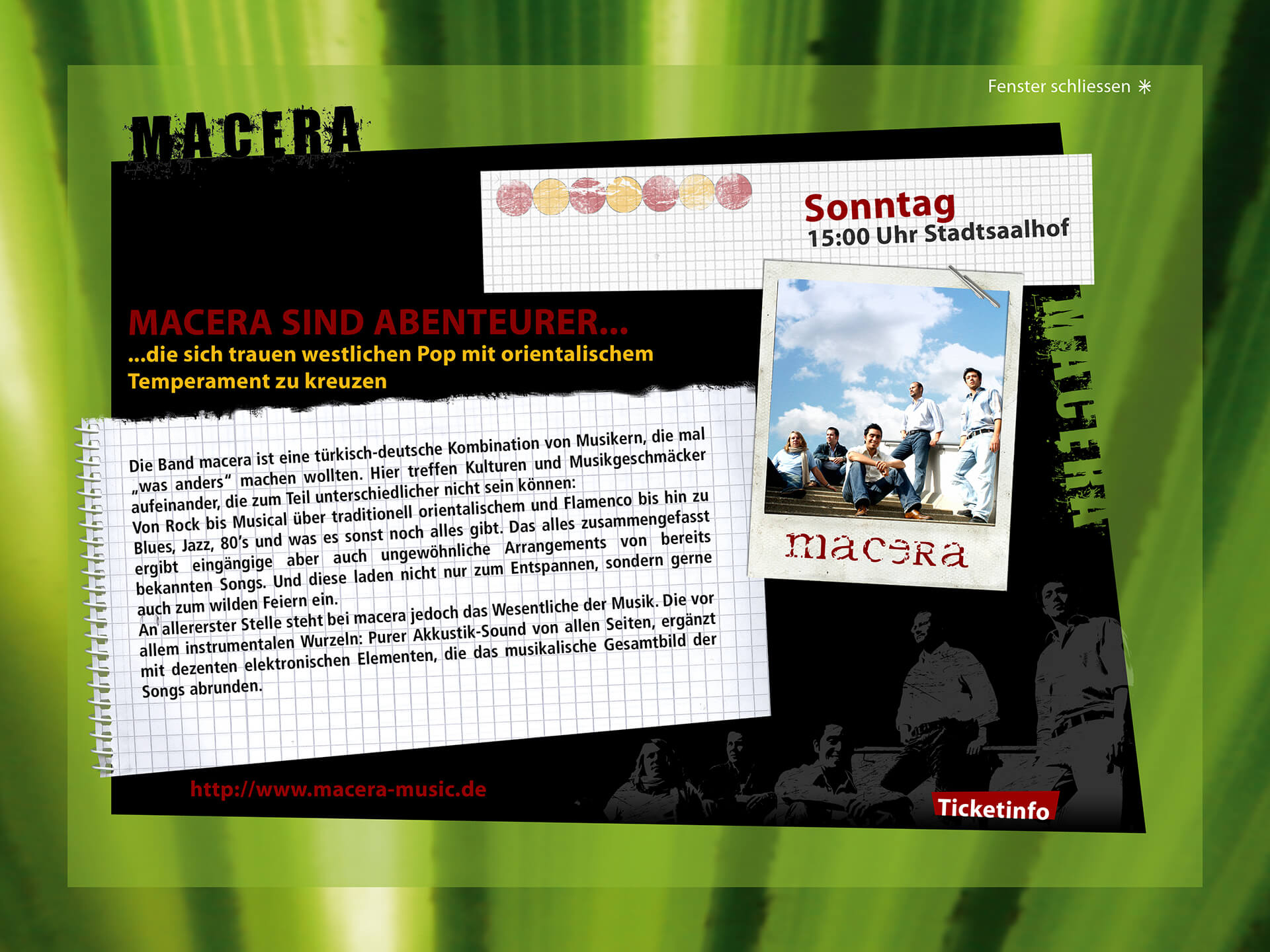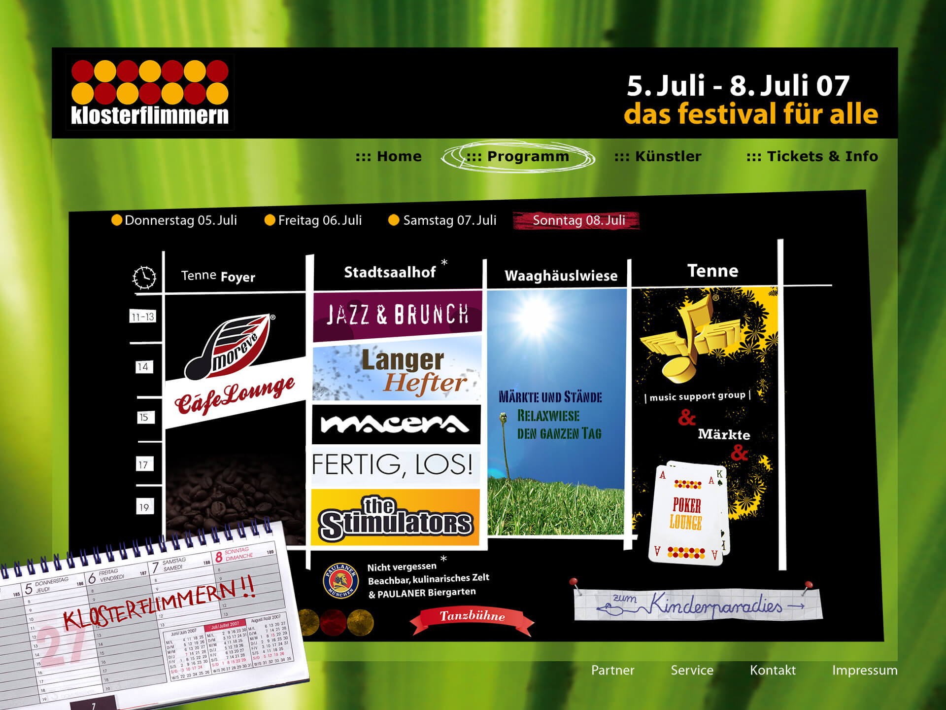 When I worked for the Music Support Group, I designed various pages for the website. We chose an unusual, playful, handmade look for the style. The subcategories were band profiles and information about stands, markets, parties, and events. I was also on site during the event and worked as a barista in the café lounge.
