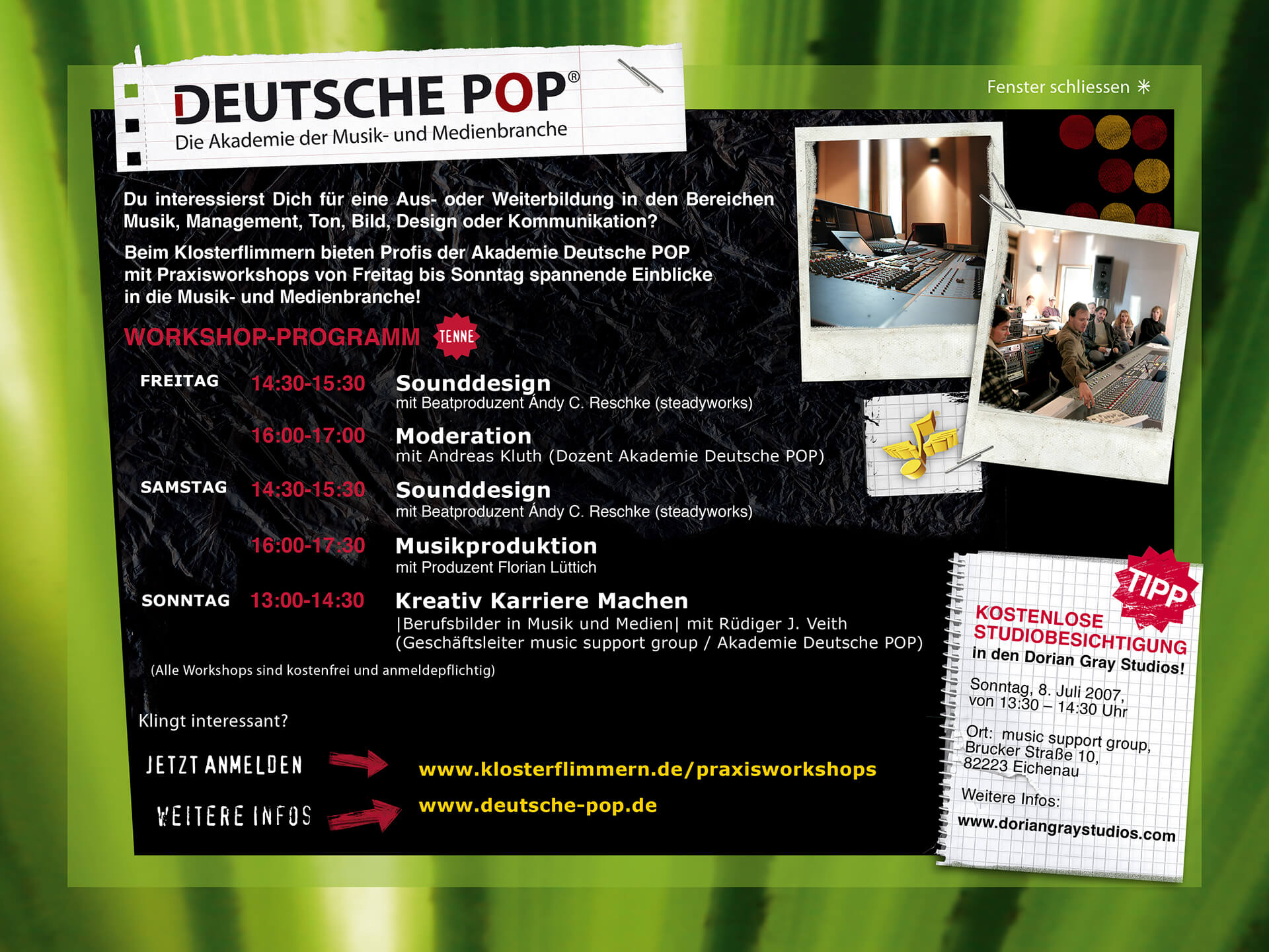 The “Klosterflimmern” event was a multi-day festival held on the grounds of the Fürstenfeld monastery in Fürstenfeldbruck from July 5 to 8, 2007. It was a summer cultural festival with a wide range of activities, including live concerts, parties, cabaret, workshops (music/media), and a chill-out lawn. The venue was the Fürstenfeldbruck monastery grounds (near Munich).